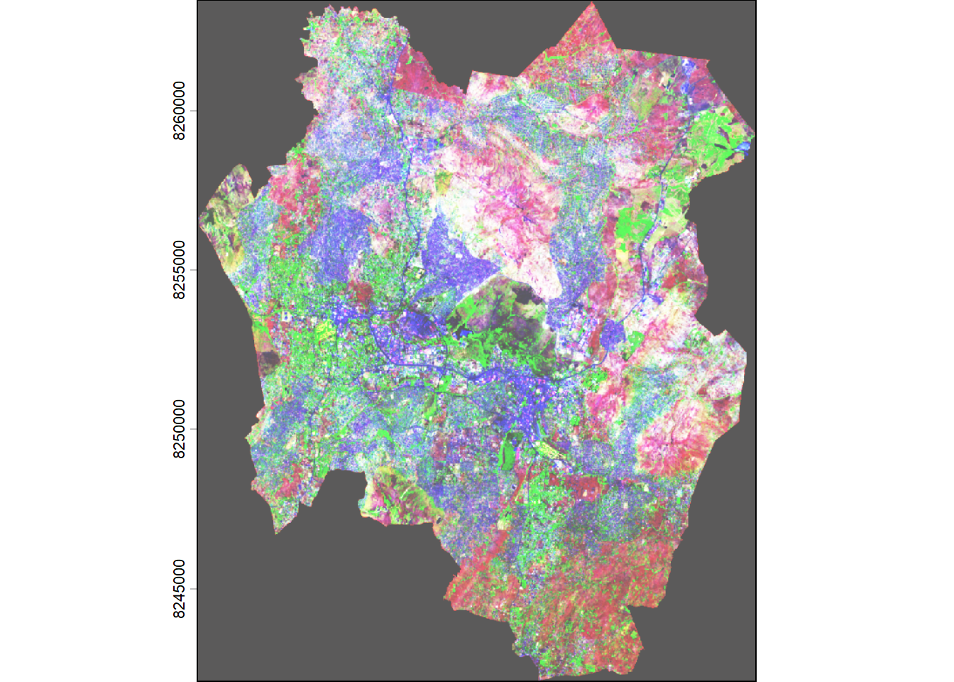 # bt <st_transform(bt, st_crs(b1))Crop the multiband image to city boundary bounding box. This trims the raster size.