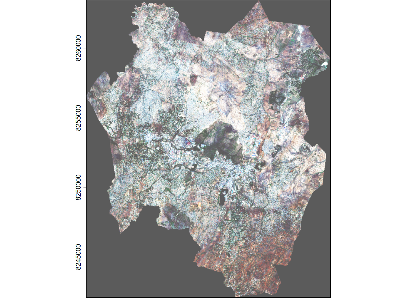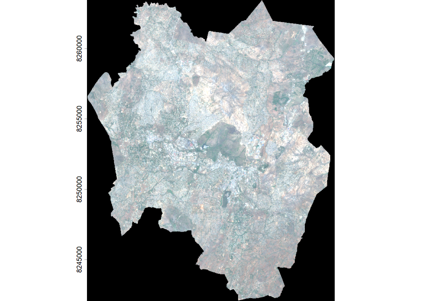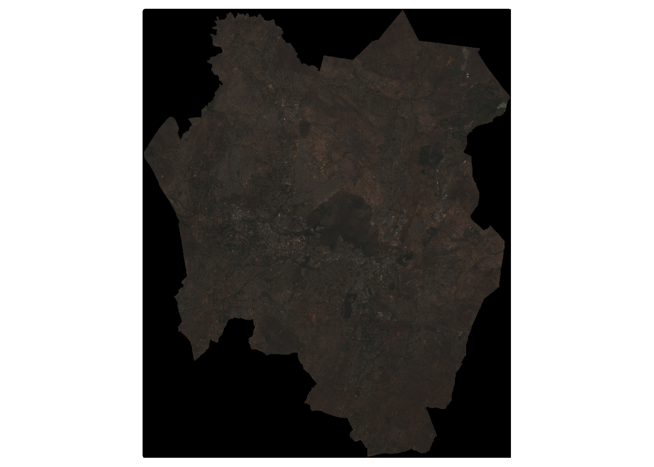 You will use the SpatVector (shapefile) for the study area (Blantyre city) to crop the image to city boundary so as not to plot no data values(black portions)