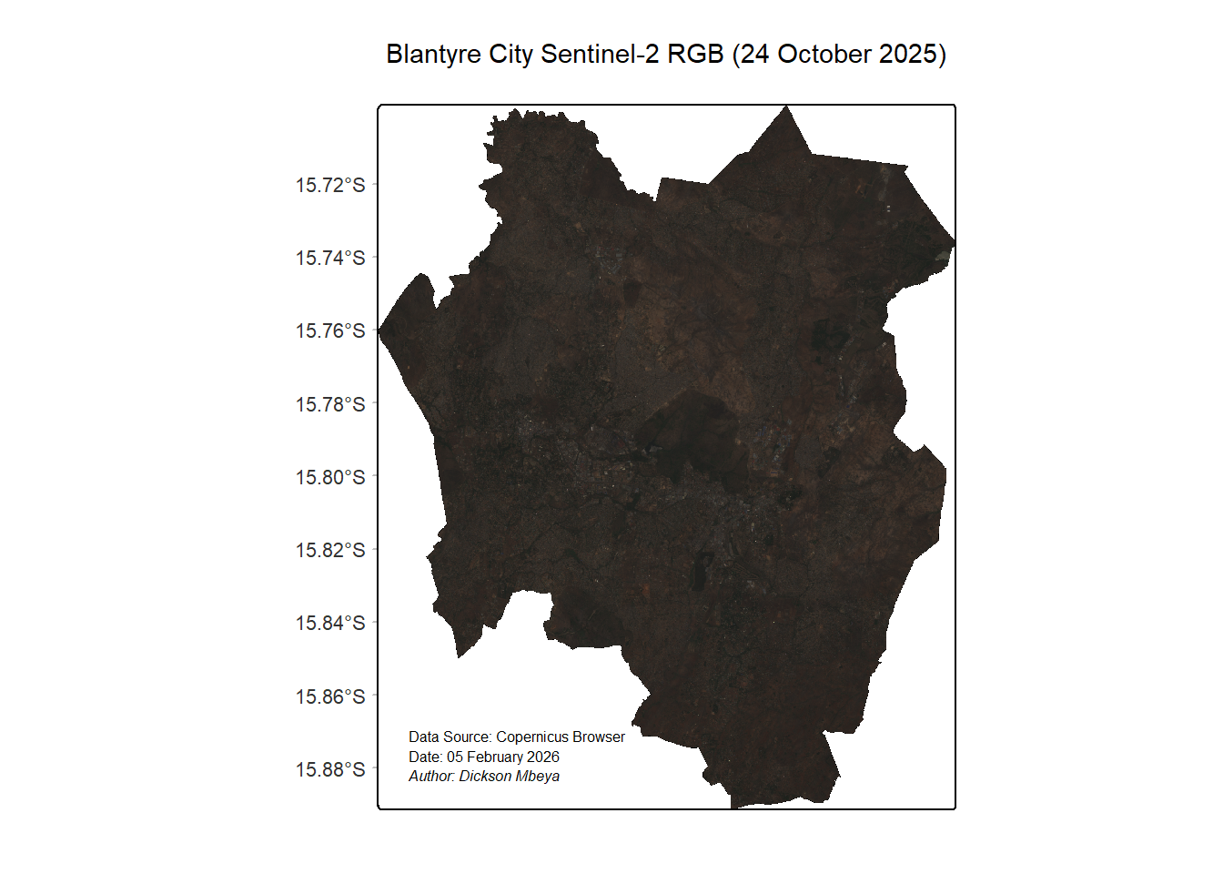 tm_title("Blantyre City Sentinel-2 RGB (24 October 2025)",