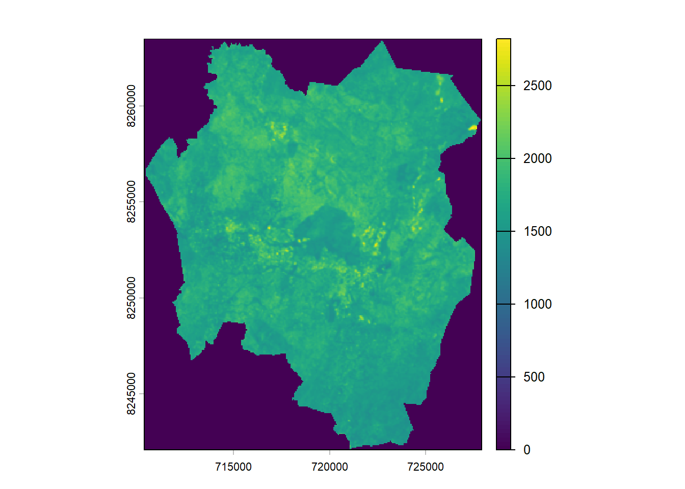 terrapackage in R to store and work with gridded spatial data. It represents data arranged in rows and columns of cells (pixels), where each cell has a value and a geographic location. A SpatRaster can contain one layer(single band) or multiple layers (multiple bands) in the same object.- One band = a single-layer SpatRaster