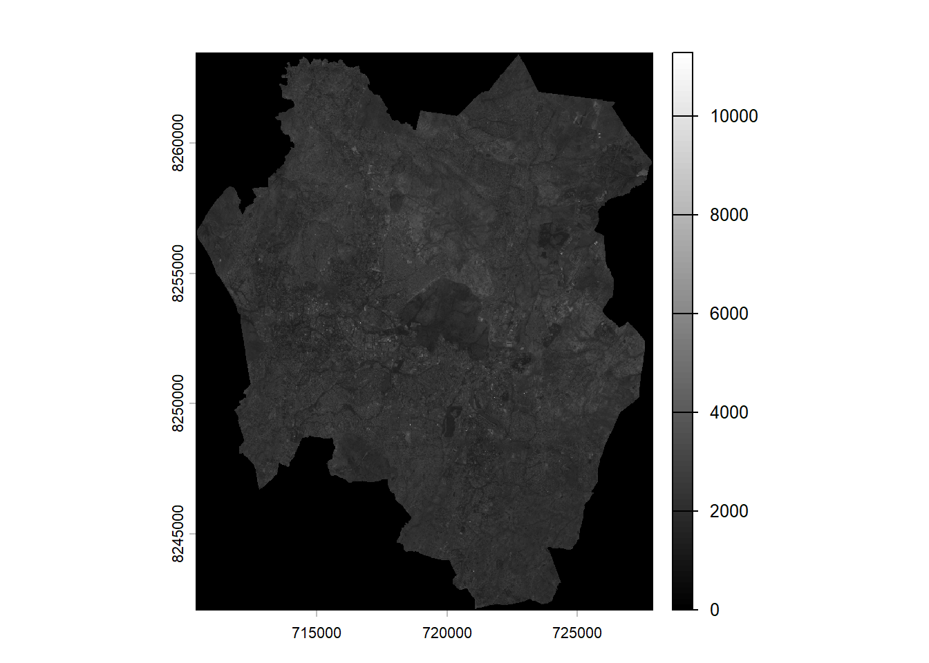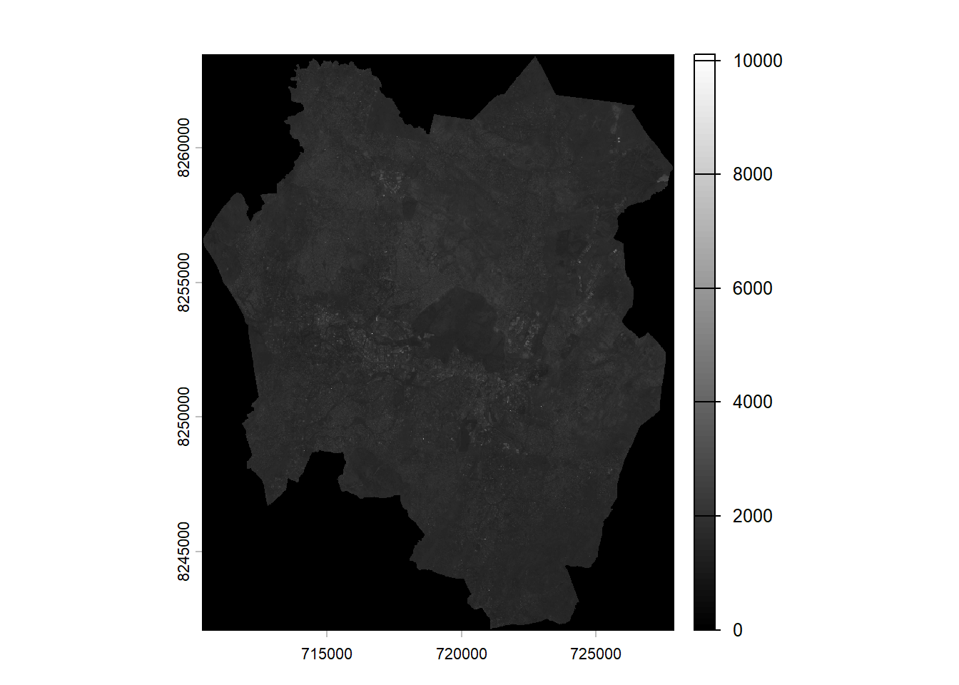crs(b1) # check the coordinate reference system for the band[1] "PROJCRS[\"WGS 84 / UTM zone 36S\",\n BASEGEOGCRS[\"WGS 84\",\n DATUM[\"World Geodetic System 1984\",\n ELLIPSOID[\"WGS 84\",6378137,298.257223563,\n LENGTHUNIT[\"metre\",1]]],\n PRIMEM[\"Greenwich\",0,\n ANGLEUNIT[\"degree\",0.0174532925199433]],\n ID[\"EPSG\",4326]],\n CONVERSION[\"UTM zone 36S\",\n METHOD[\"Transverse Mercator\",\n ID[\"EPSG\",9807]],\n PARAMETER[\"Latitude of natural origin\",0,\n ANGLEUNIT[\"degree\",0.0174532925199433],\n ID[\"EPSG\",8801]],\n PARAMETER[\"Longitude of natural origin\",33,\n ANGLEUNIT[\"degree\",0.0174532925199433],\n ID[\"EPSG\",8802]],\n PARAMETER[\"Scale factor at natural origin\",0.9996,\n SCALEUNIT[\"unity\",1],\n ID[\"EPSG\",8805]],\n PARAMETER[\"False easting\",500000,\n LENGTHUNIT[\"metre\",1],\n ID[\"EPSG\",8806]],\n PARAMETER[\"False northing\",10000000,\n LENGTHUNIT[\"metre\",1],\n ID[\"EPSG\",8807]]],\n CS[Cartesian,2],\n AXIS[\"(E)\",east,\n ORDER[1],\n LENGTHUNIT[\"metre\",1]],\n AXIS[\"(N)\",north,\n ORDER[2],\n LENGTHUNIT[\"metre\",1]],\n USAGE[\n SCOPE[\"Navigation and medium accuracy spatial referencing.\"],\n AREA[\"Between 30°E and 36°E, southern hemisphere between 80°S and equator, onshore and offshore. Burundi. Eswatini (Swaziland). Kenya. Malawi. Mozambique. Rwanda. South Africa. Tanzania. Uganda. Zambia. Zimbabwe.\"],\n BBOX[-80,30,0,36]],\n ID[\"EPSG\",32736]]"