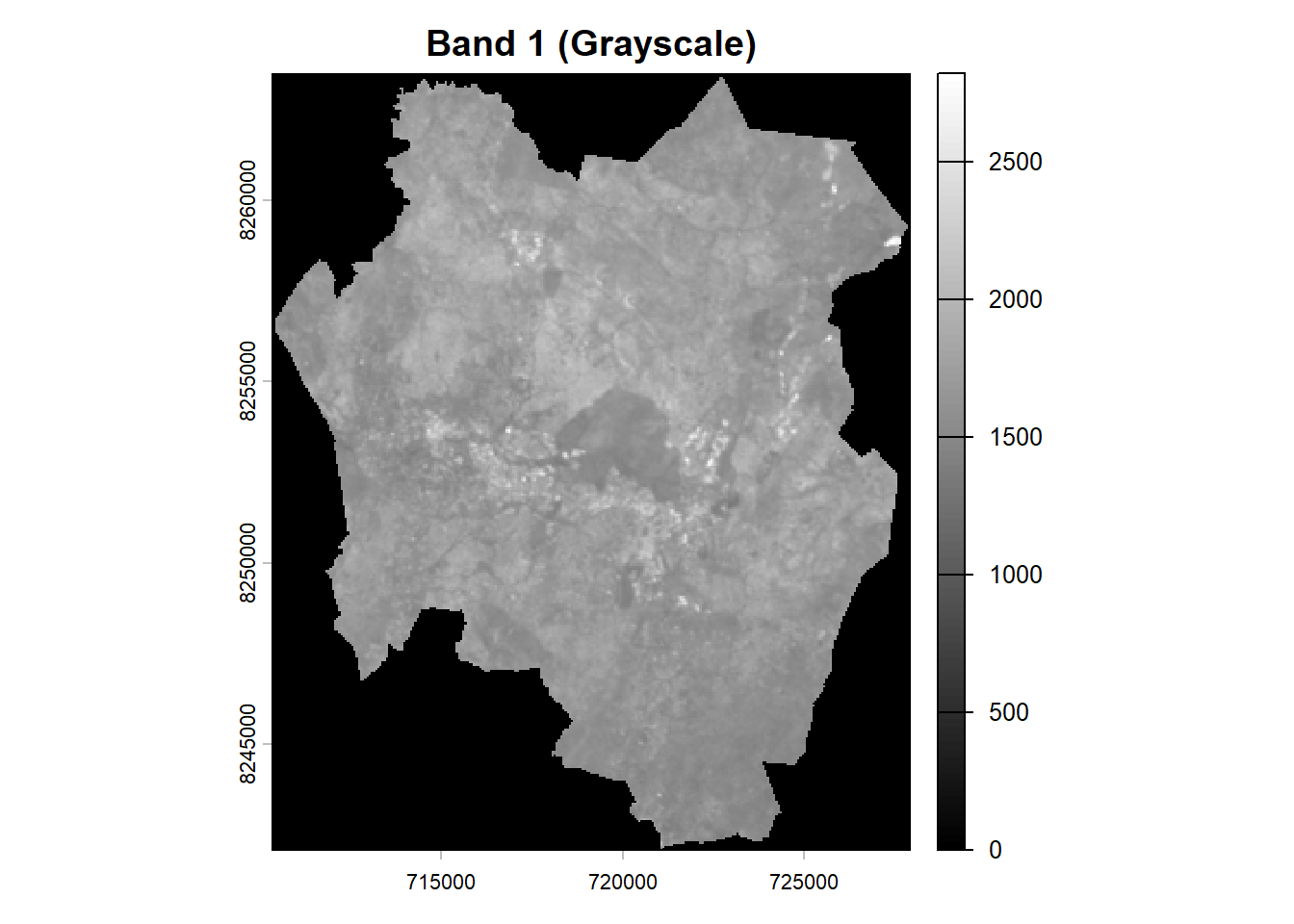 plot(b1, col = gray(0:100/100), main = "Band 1 (Grayscale)")