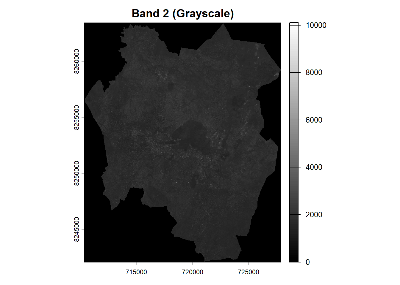 plot(b2, col = gray(0:100/100), main = "Band 2 (Grayscale)")
