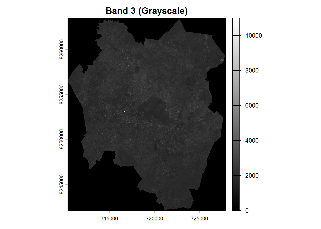 plot(b3, col = gray(0:100/100), main = "Band 3 (Grayscale)")