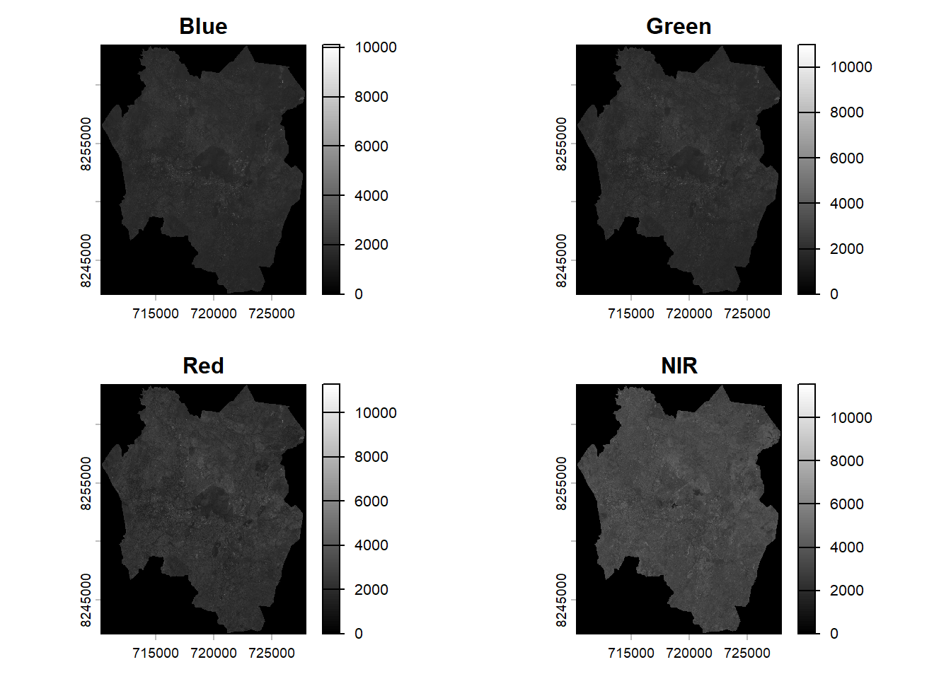 names(s2) <- c('b1', 'b2', 'b3', 'b4', 'b5', 'b6', 'b7', 'b8', 'b8a', 'b9', 'b11', 'b12')The code above stacks individual Sentinel-2 spectral bands into a single multiband raster and assigns meaningful names to each band.